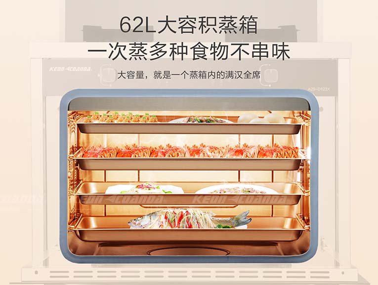 集成灶十大品牌、廚電行業(yè)十大品牌科恩D123X蒸烤消一體集成灶,擁有62L大容積內(nèi)膽,內(nèi)部設(shè)有多層蒸架,選用進(jìn)口“薩萊米”陶瓷加熱盤,噴氣式4D立體蒸,噴氣升溫快,能迅速讓蒸汽達(dá)到腔內(nèi)各個區(qū)域,從而實(shí)現(xiàn)無冷角均勻加熱,蒸汽快速升騰,縮短了加熱的時間,鎖住了營養(yǎng),實(shí)現(xiàn)食物的原汁原味,使烹飪更加鮮美!