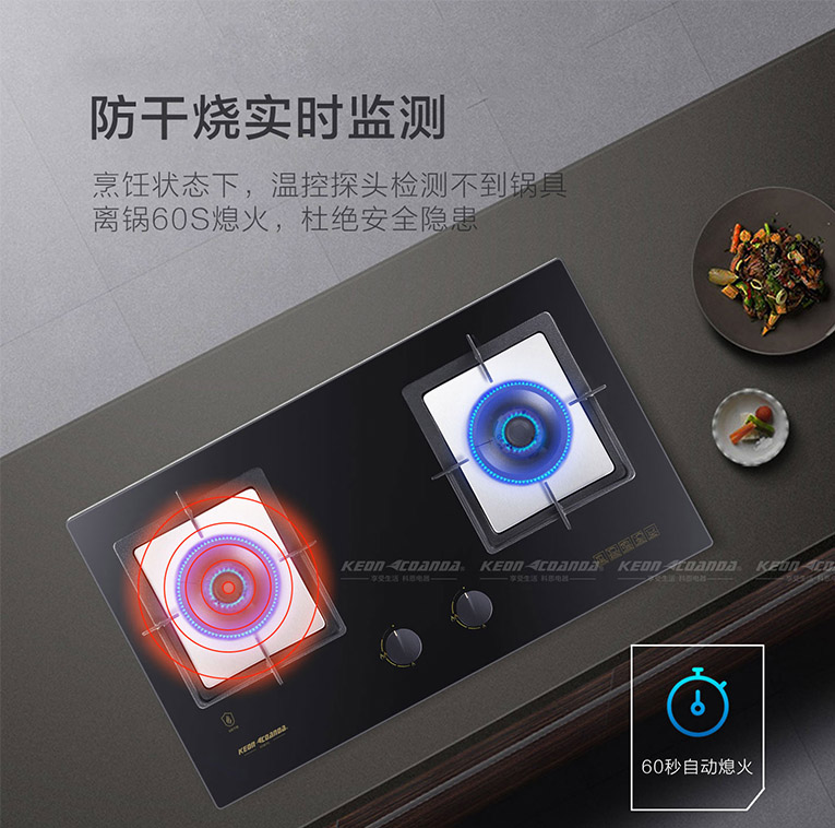 另外,大多數(shù)家在購(gòu)買廚電的時(shí)候順手買個(gè)燃?xì)庠睿](méi)有專門的去選購(gòu)一款適合的、安全的燃?xì)庠?。這就導(dǎo)致了一些家庭的廚房安全沒(méi)有辦法得到保障,會(huì)出現(xiàn)燒干鍋、鍋空燃等安全隱患。KN610智能防干燒灶具擁有防干燒裝置功能,左爐頭帶日本進(jìn)口探頭防干燒裝置,意外忘記關(guān)火外出干燒時(shí),將會(huì)自動(dòng)關(guān)火,同時(shí)當(dāng)鍋離開(kāi)60S時(shí)將自動(dòng)熄火,杜絕了安全隱患!