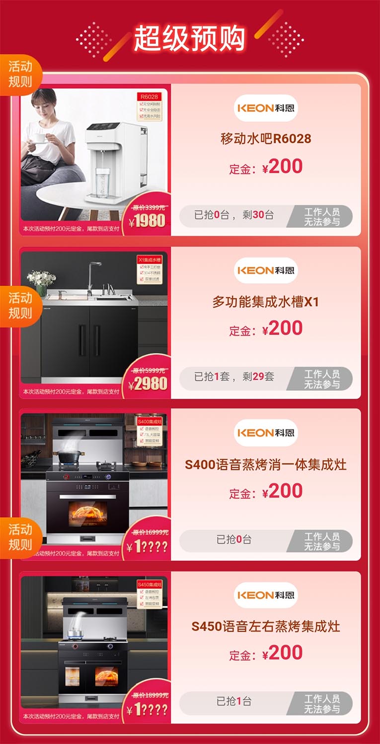 本次超大力度的科恩蒸烤節(jié)活動獲得了消費者廣泛的參與和關(guān)注,爆款產(chǎn)品加入套餐,助力線下終端門店銷量騰飛。9.9元特權(quán)卡,限量搶購,購物更省錢,預付9.9元就能抵用金額200元(無門檻),特權(quán)一:享受到當?shù)乜贫鏖T店200元抵扣(特價機型除外)、特權(quán)二:享受全國科恩門店實時優(yōu)惠、特權(quán)三:保價全年買貴退差價;