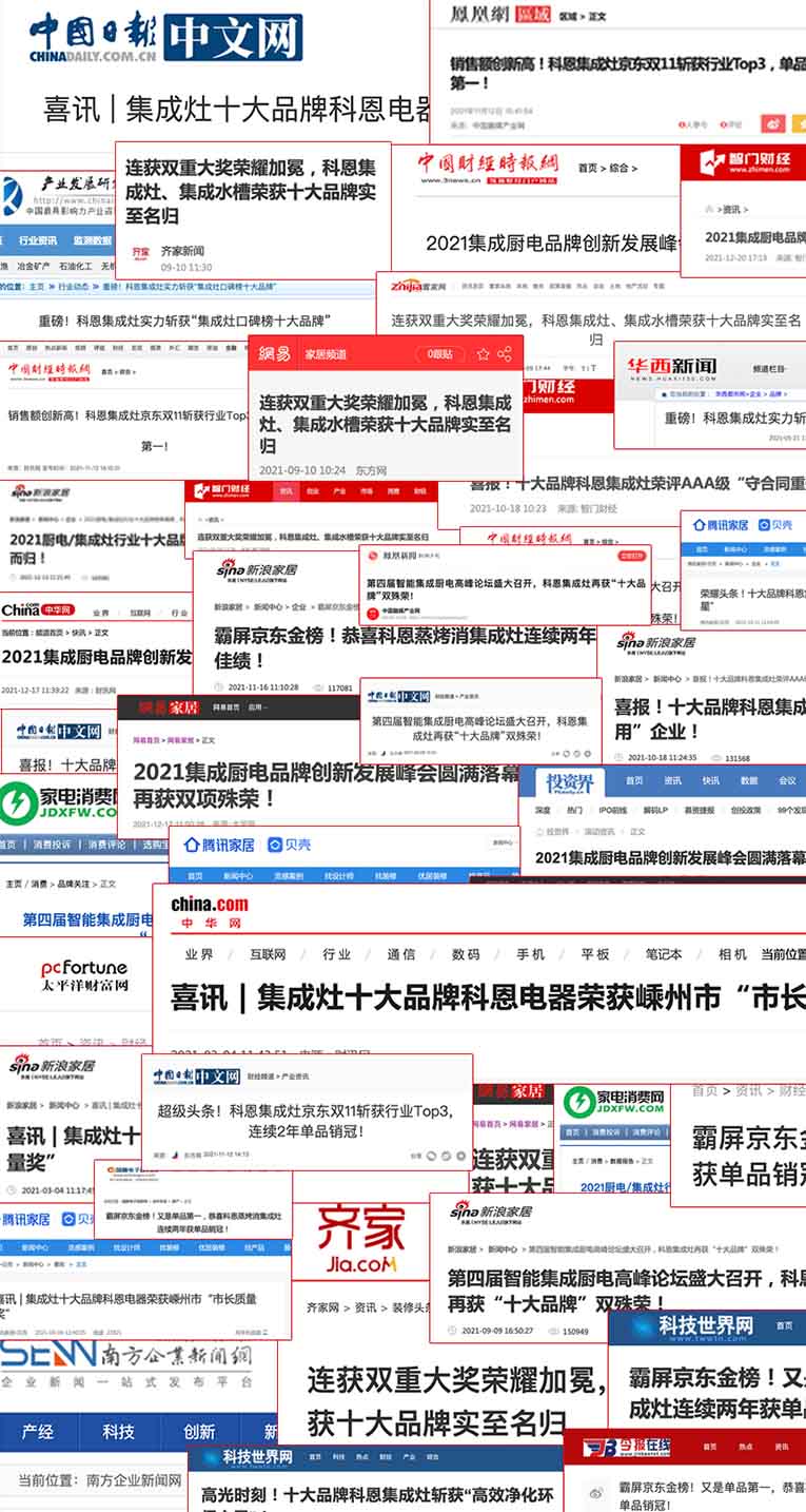 是榮譽,更是責任,酒香不怕巷子深,科恩集成灶十二余年品牌沉淀,始終保持初心砥礪前行,得到越來越多用戶的認可,備受市場、消費者關注,百余家媒體爭相報道,為科恩高速發展做出了積極的貢獻。