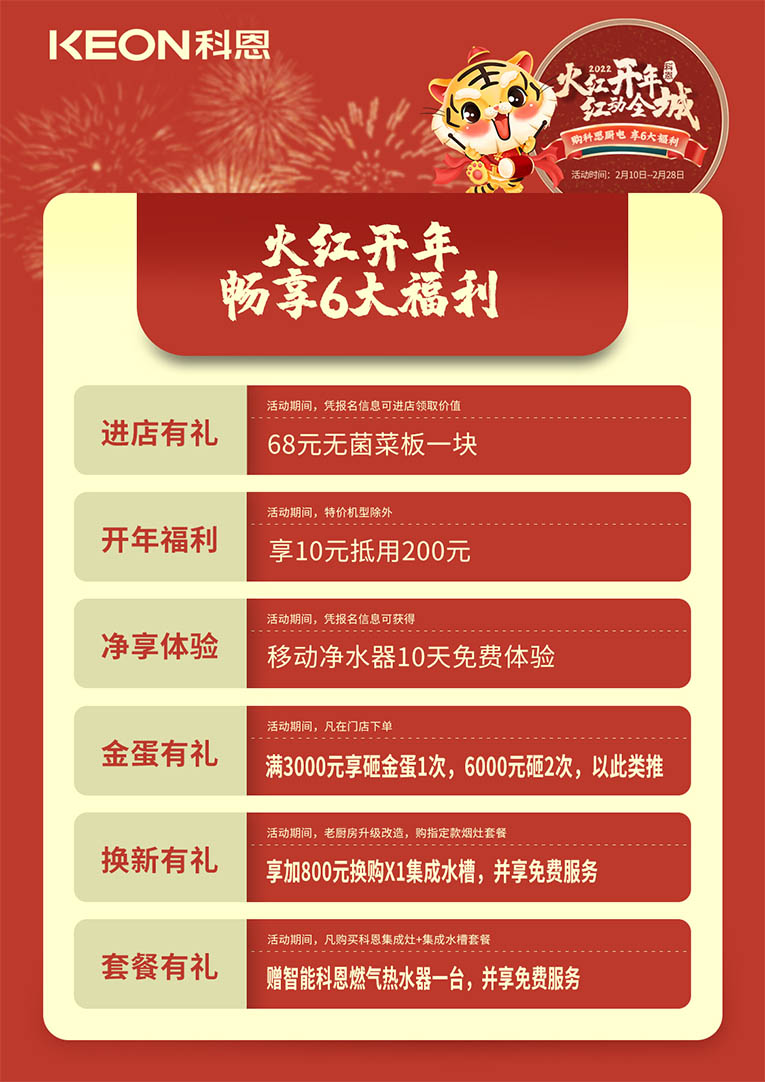 新年新氣象,新舊物品的更迭,不僅是告別過去的一年,更是蘊藏對新一年的憧憬~新的一年,集成灶十大品牌、廚電行業十大品牌科恩集成灶“火紅開年,紅動全城”活動,加持您的新氣象,“灶”就虎虎生威的2022!