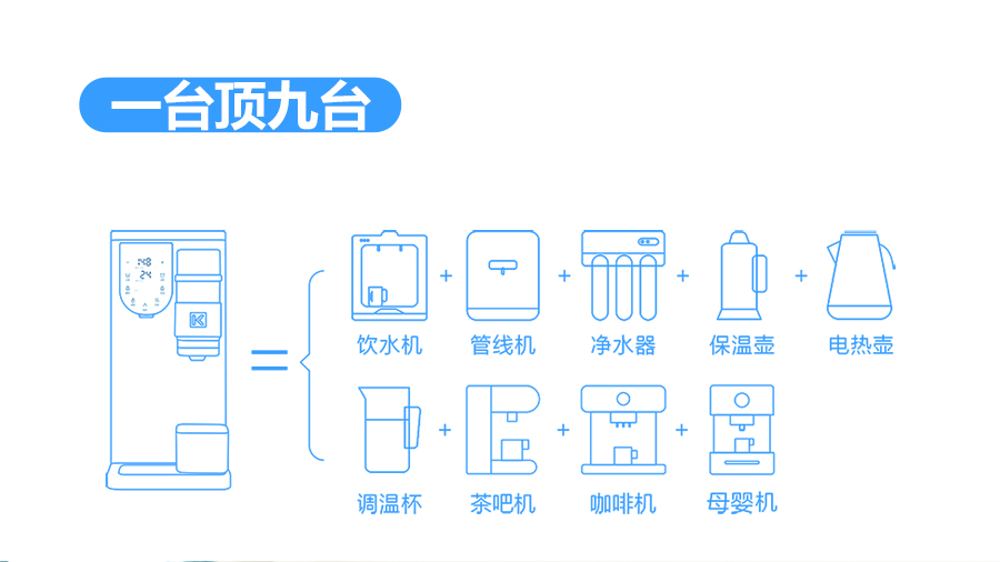 科恩多功能移動式凈水器,憑借UV殺菌、凈廢分離、茶吧泡茶功能,完全替代了廚下機、熱水壺、保溫壺、飲水機、管線機等設備,以無空間、無水源限制的優勢,徹底顛覆了傳統凈水器諸多局限,從根本上滿足用戶對不同環境的飲水需求,產品還通過了中國CMA106項水質標準檢測,水質達到了直接飲用標準!