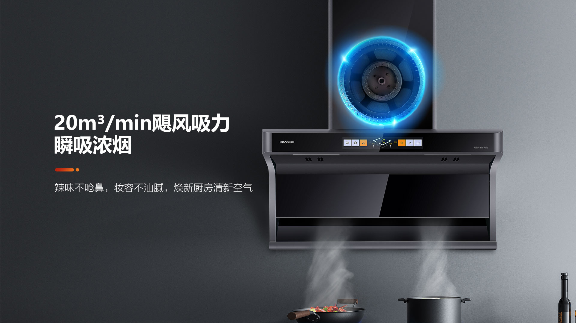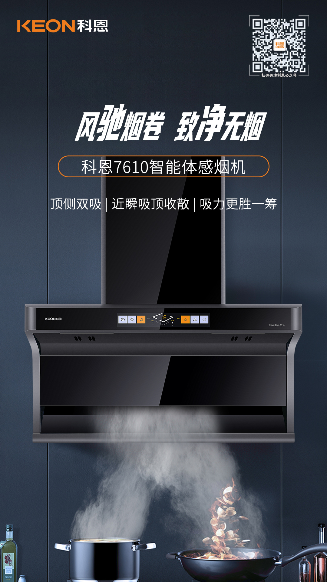 不愛下廚的理由千千萬(wàn):油煙抽不盡、味道散不出、滿室油膩膩、清潔難打理一定是阻礙我們廚藝進(jìn)階的頭號(hào)勁敵!選擇一臺(tái)好的煙機(jī),下廚煩惱一招便可迎刃而解,科恩7610頂側(cè)雙吸智能體感煙機(jī),上下雙吸組合出擊,配合颶風(fēng)大吸力,將油煙一網(wǎng)打盡,還你清新廚房!