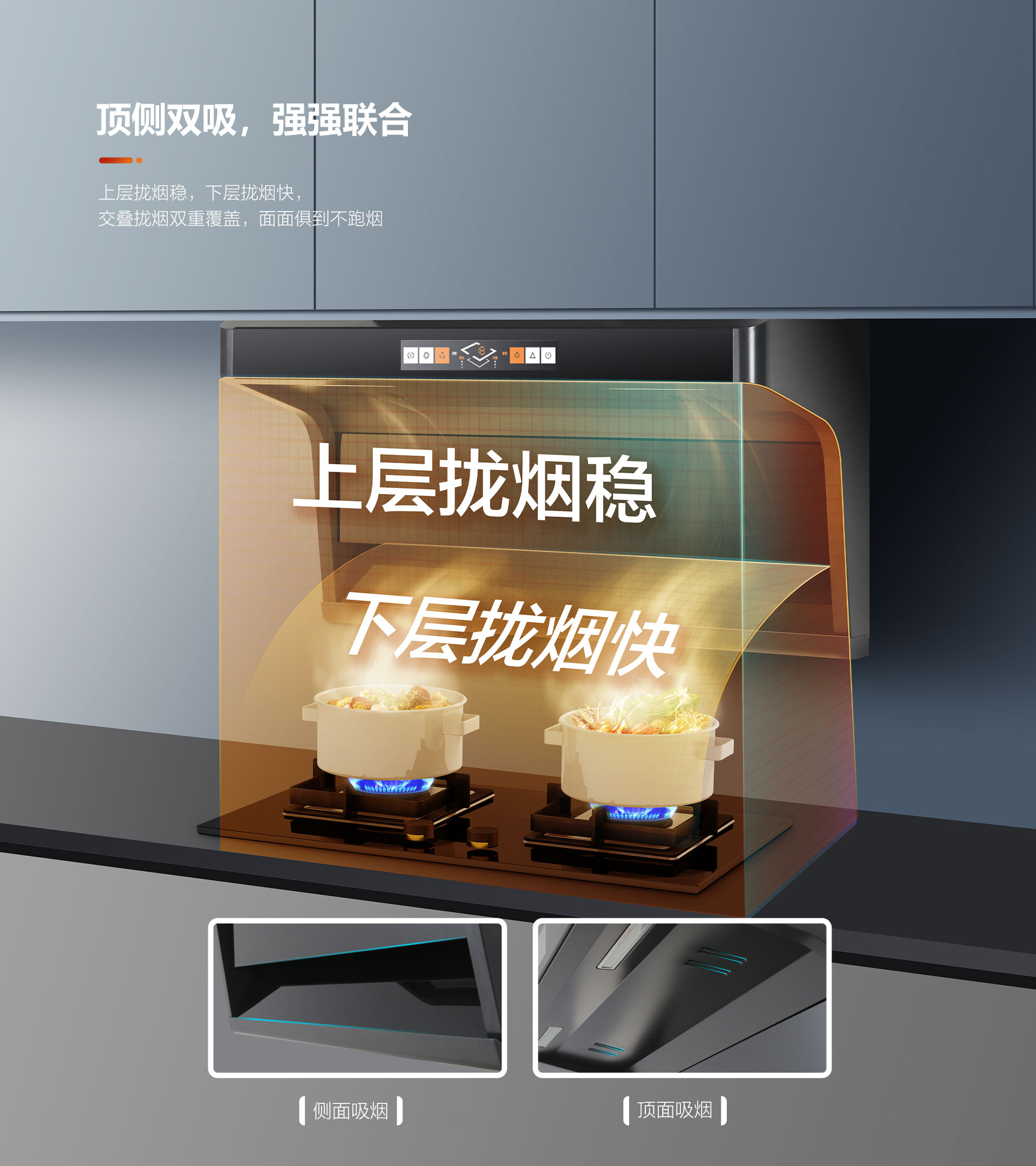 下近吸,側(cè)吸下捕攏煙快,近距離攏吸油煙,抽凈爆炒油煙,把油煙扼殺在萌芽之中,快速凈煙不上臉。上攏吸,高位頂吸攏煙穩(wěn),輔助捕捉剩余逃逸的油煙,排盡余煙不嗆鼻。