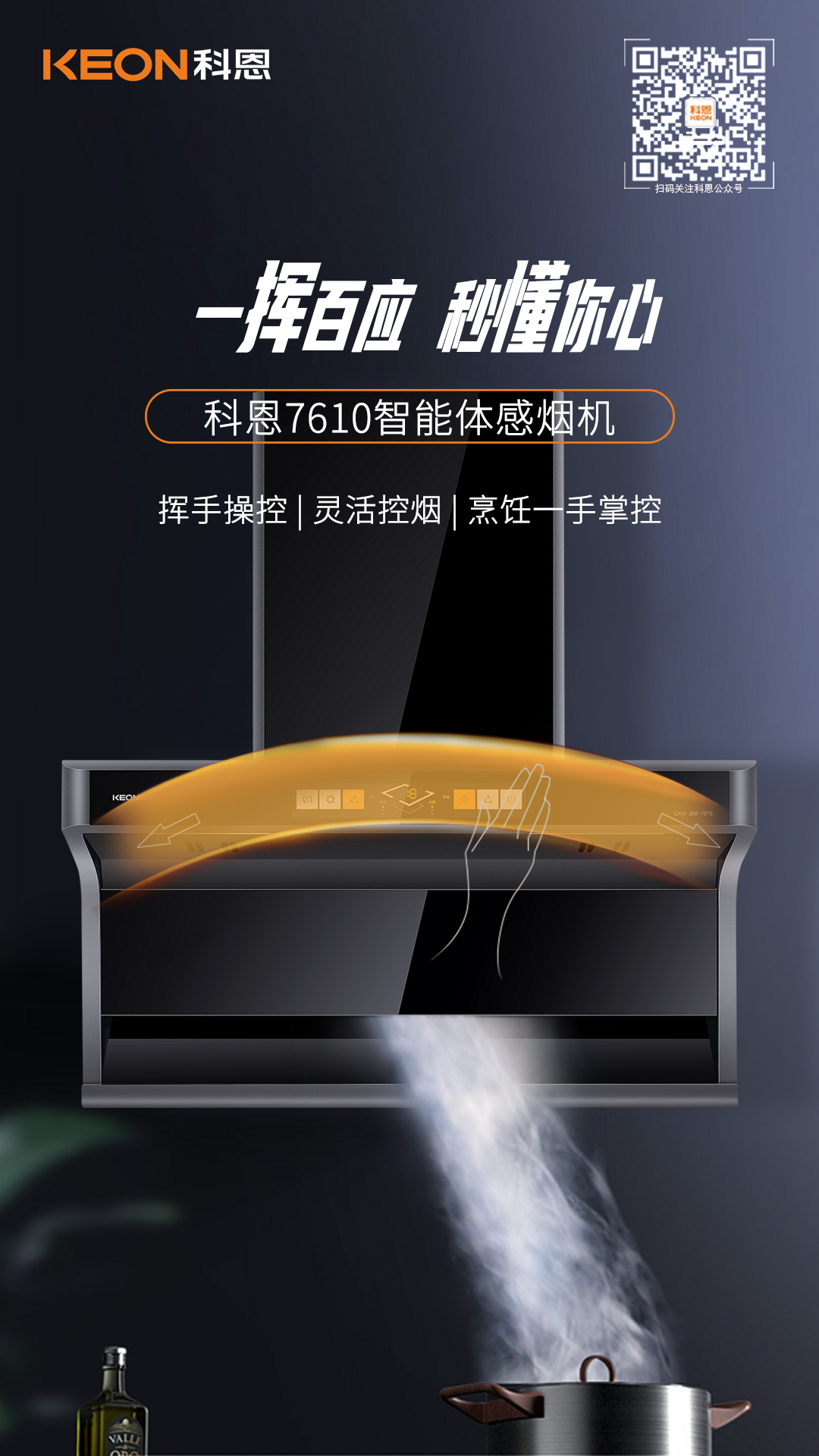 科恩7610采用了智能體感操控系統(tǒng),無(wú)需觸碰煙機(jī),揮手凈煙,告別繁瑣清潔步驟,更能有效避免手濕油膩導(dǎo)致的觸控不靈敏問(wèn)題,煙機(jī)不留油污、手印,面板時(shí)刻干凈免潔!