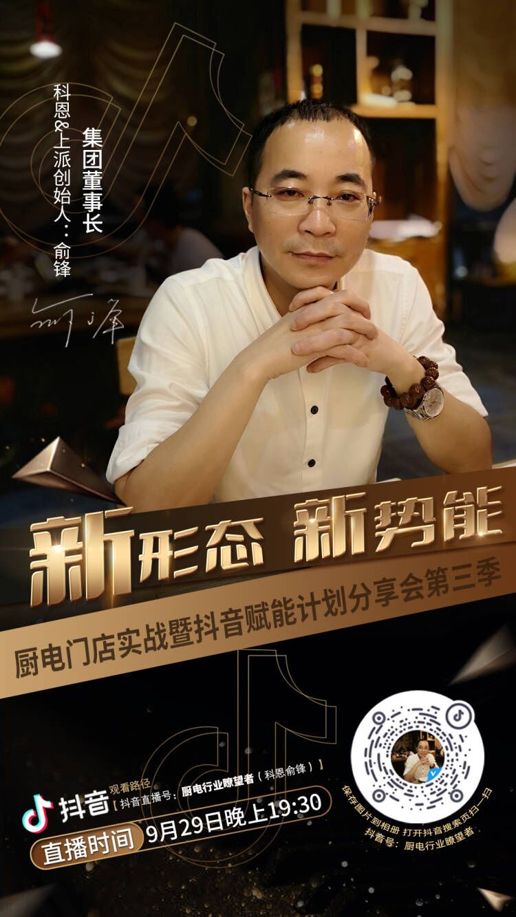 集團(tuán)董事長(zhǎng)、科恩&上派創(chuàng)始人俞鋒親自領(lǐng)軍征戰(zhàn)新零售流量變現(xiàn)風(fēng)口,科恩新媒體事業(yè)中心資深團(tuán)隊(duì)導(dǎo)師護(hù)航,助力廚電行業(yè)實(shí)體店打造線上引流線下獲客的私域裂變!9月29日19:30, 鎖定抖音直播間,董事長(zhǎng)俞鋒親自掛帥,為您傾情分享新形態(tài)下實(shí)體店聚勢(shì)掘金新勢(shì)能!