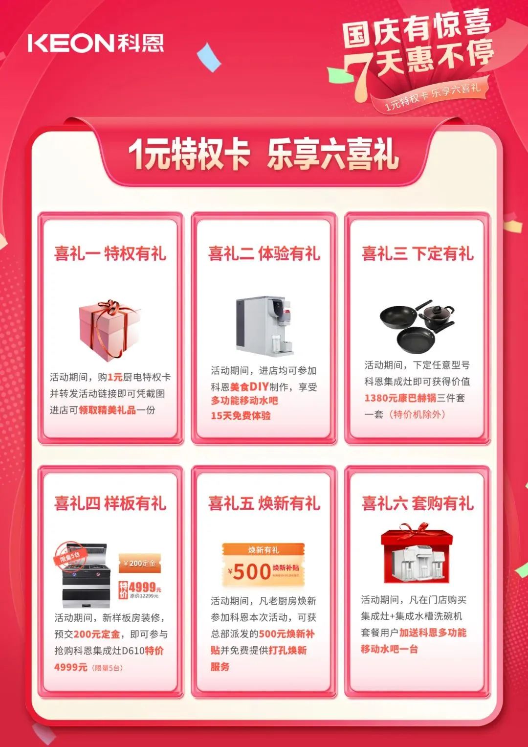 ✔ 1塊錢能干什么?在科恩集成灶,花1元即可享廚電特權(quán)卡權(quán)益,獲得驚喜禮品一份!同時(shí)還能享受科恩多功能移動(dòng)水吧15天免費(fèi)體驗(yàn)優(yōu)先使用權(quán)!