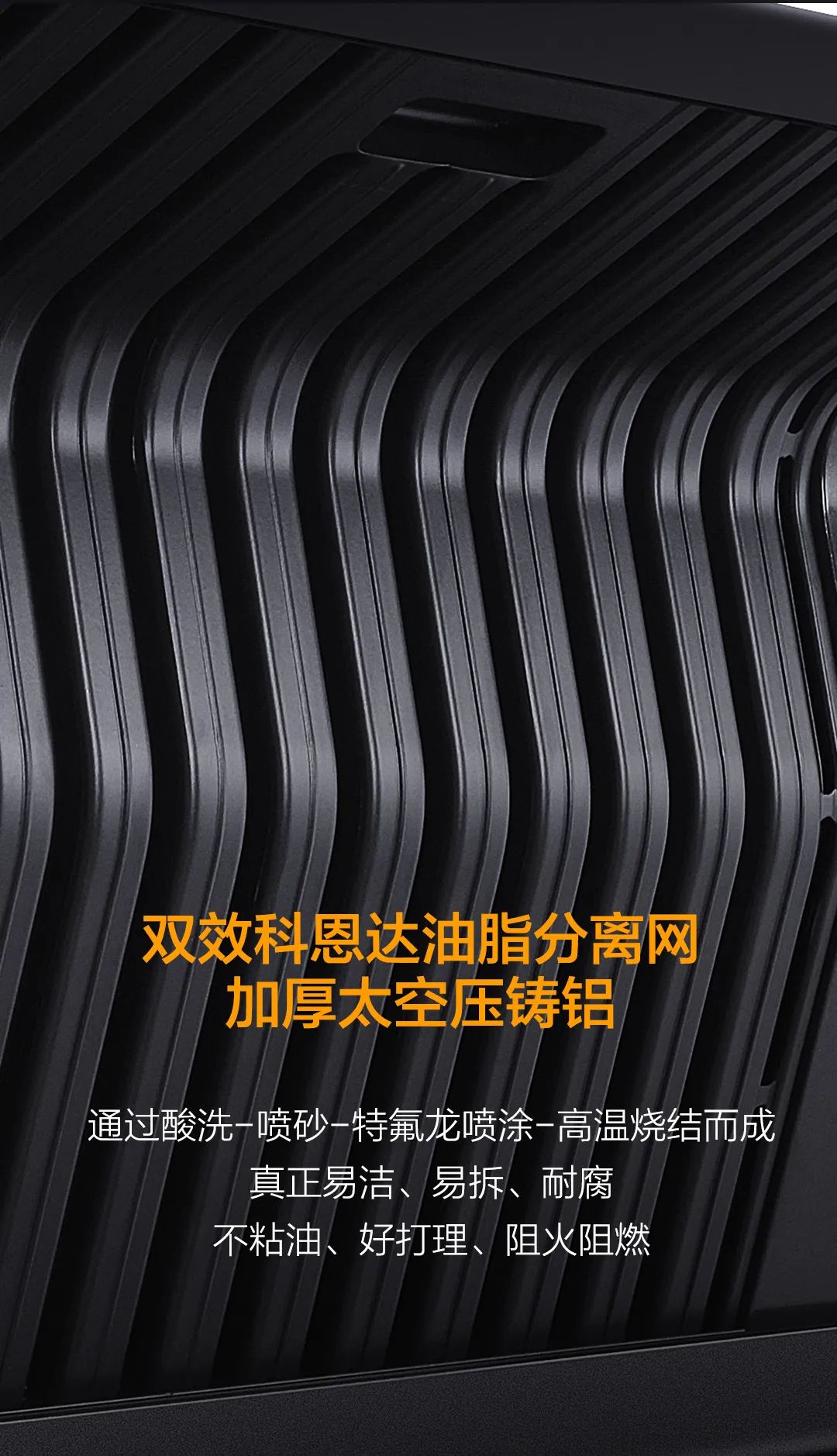 在工藝上經(jīng)過(guò)酸洗-噴砂工藝加之特氟龍噴涂最后高溫?zé)Y(jié),不僅不沾油、易清潔好打理。在分離油煙的同時(shí),還能阻燃阻熱!保障廚房安全!