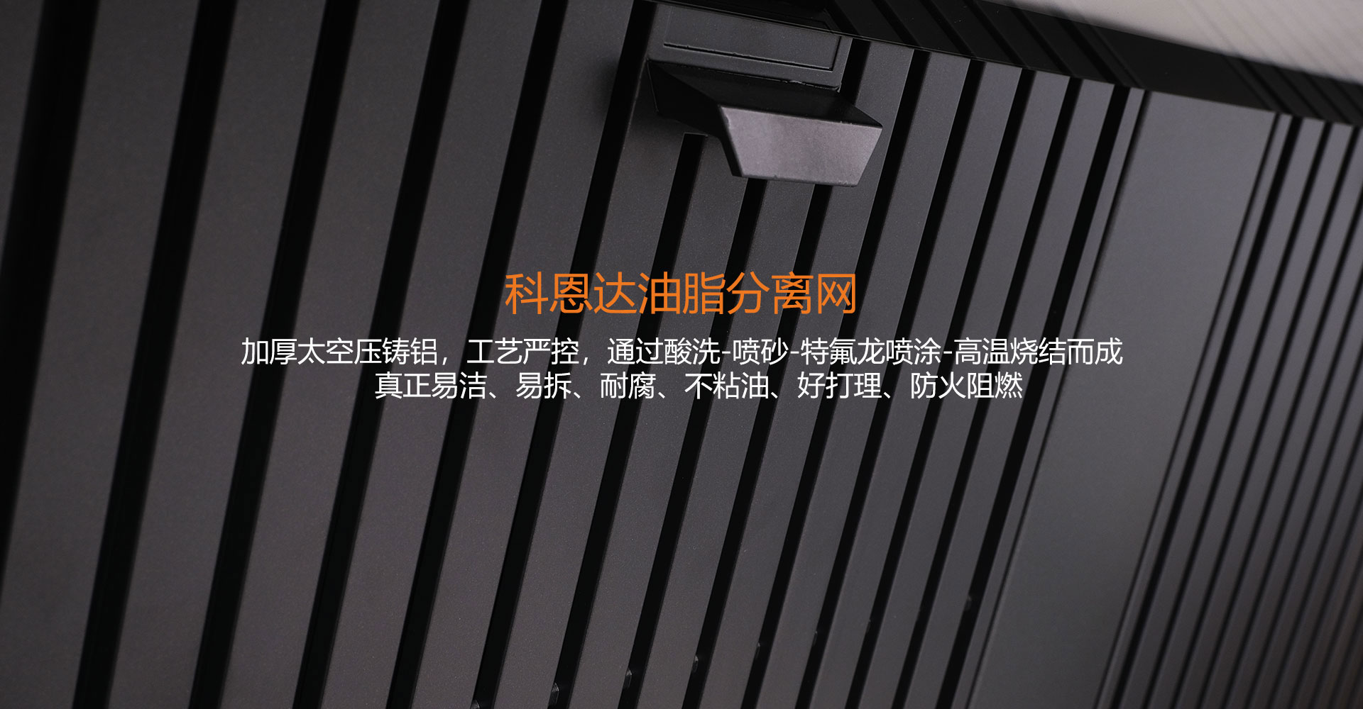 科恩達三層油脂分離網(wǎng),加厚太空壓鑄鋁,工藝嚴控,通過酸洗-噴砂-特氟龍噴涂-高溫燒結而成真正易潔、易拆、耐腐、不粘油、好打理防火阻燃。