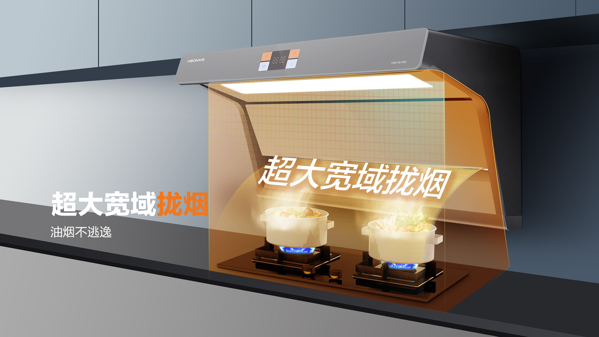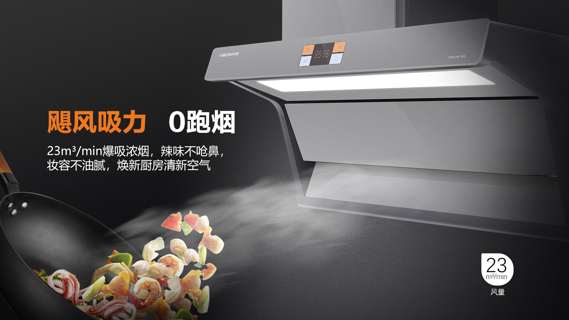 7620擁有23m3/min颶風吸力,搭配上下雙吸,強強聯合,上層攏煙穩,下層攏煙快,交疊攏煙雙重覆蓋,真正實現廚房0油煙。