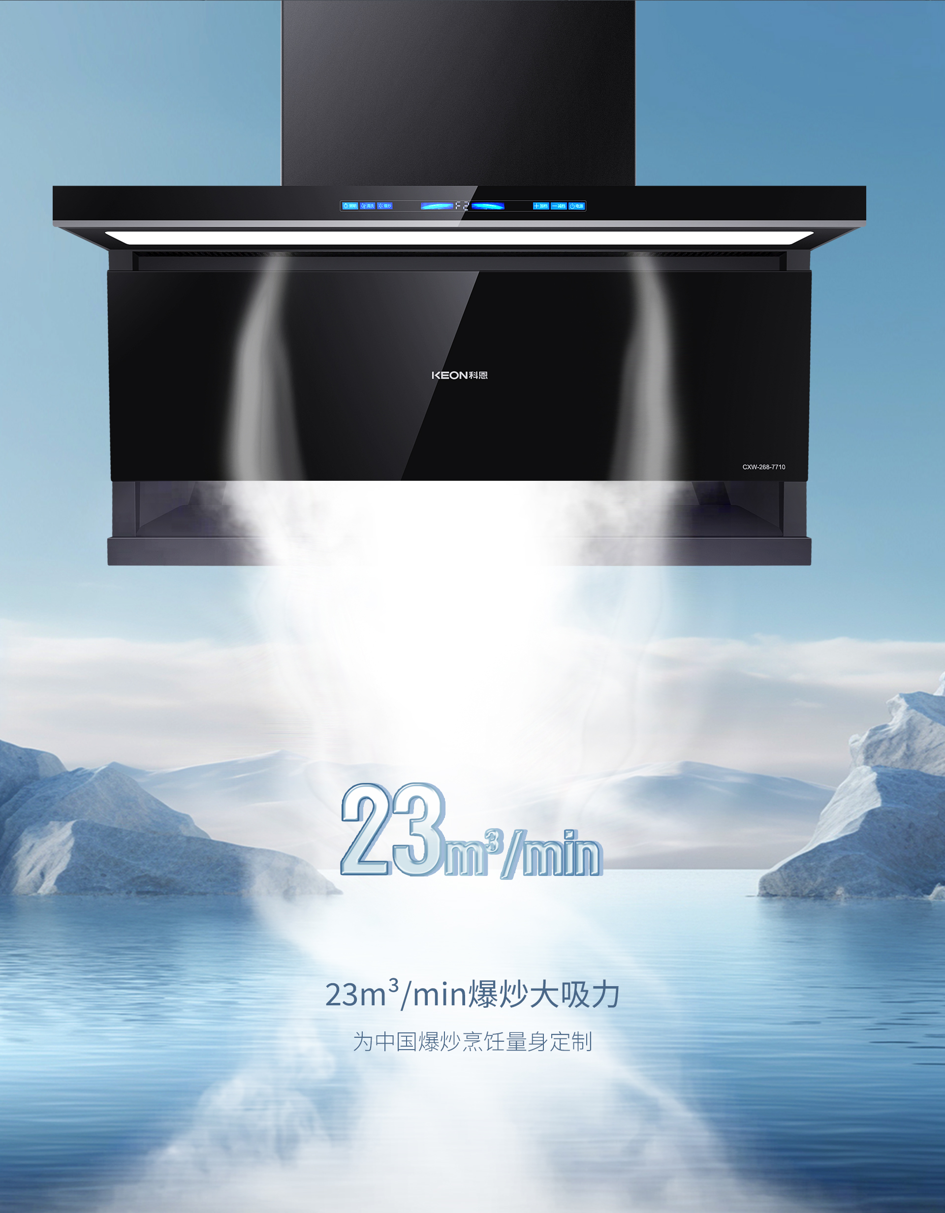 科恩7710智能聯動煙機,無疑是理想廚房的不二之選。其獨特的下吸上攏設計,頂側雙吸結構相輔相成,宛如忠誠的衛士,將油煙牢牢鎖定,絕不讓一絲一縷有機會逃逸。