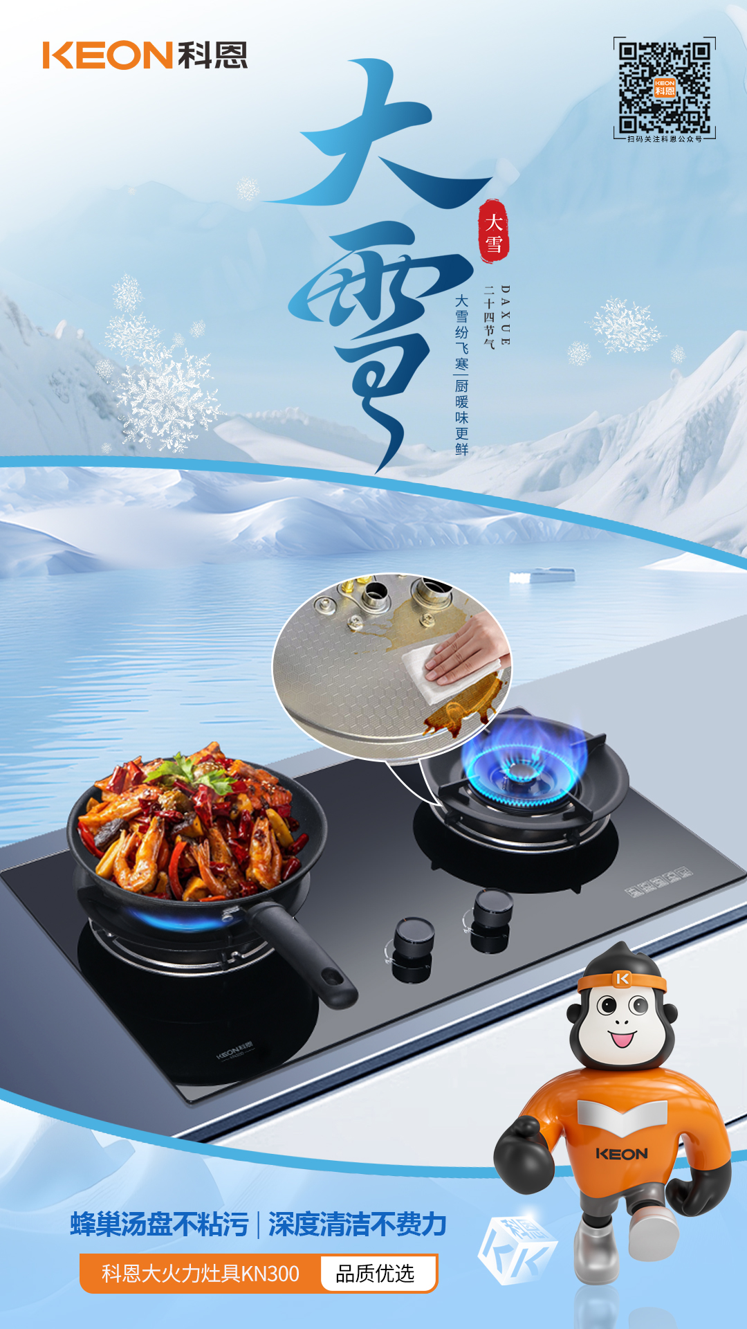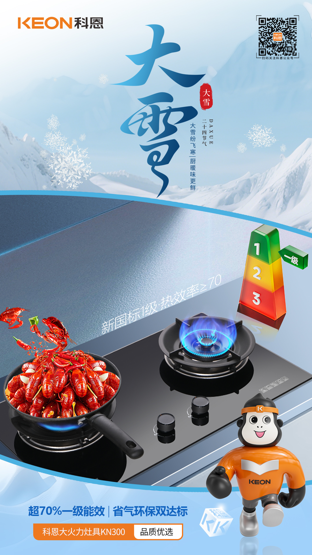 大雪煥新,暖意相伴。科恩KN300滿配實(shí)力,小灶大能,烹鮮首選,煎炒烹炸樣樣精通,健康美味輕松拿捏。選擇KN300灶具,讓大雪廚房暖意融融!