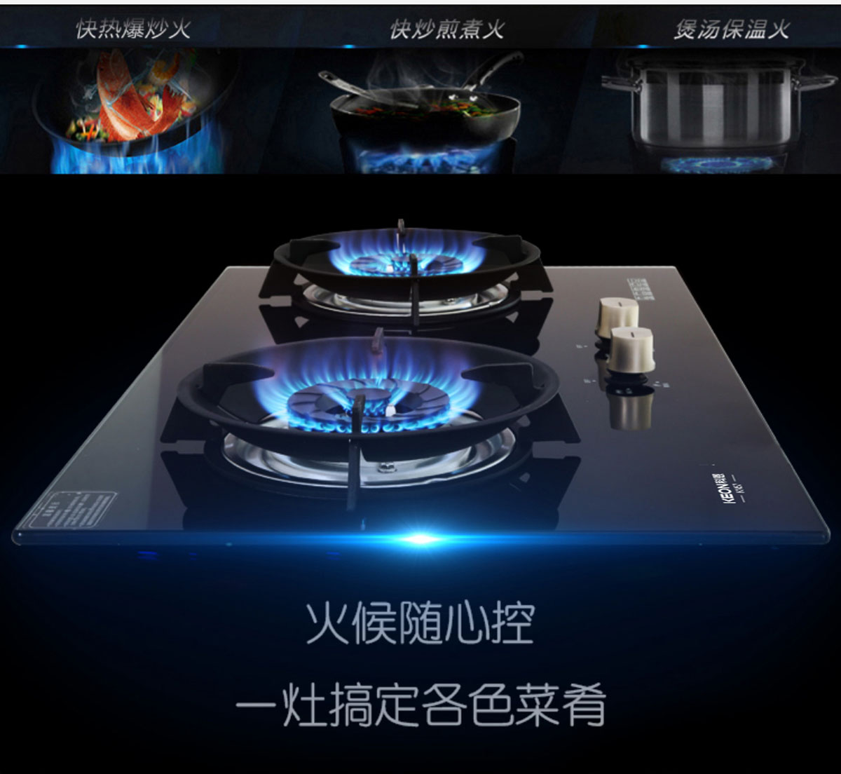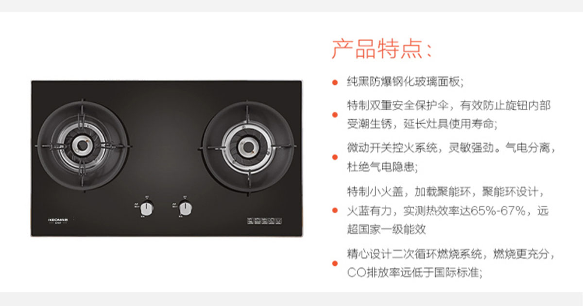 - 特制小火蓋,火藍(lán)有力,熱效率達(dá)65%-67%,高于一級能效標(biāo)準(zhǔn)。