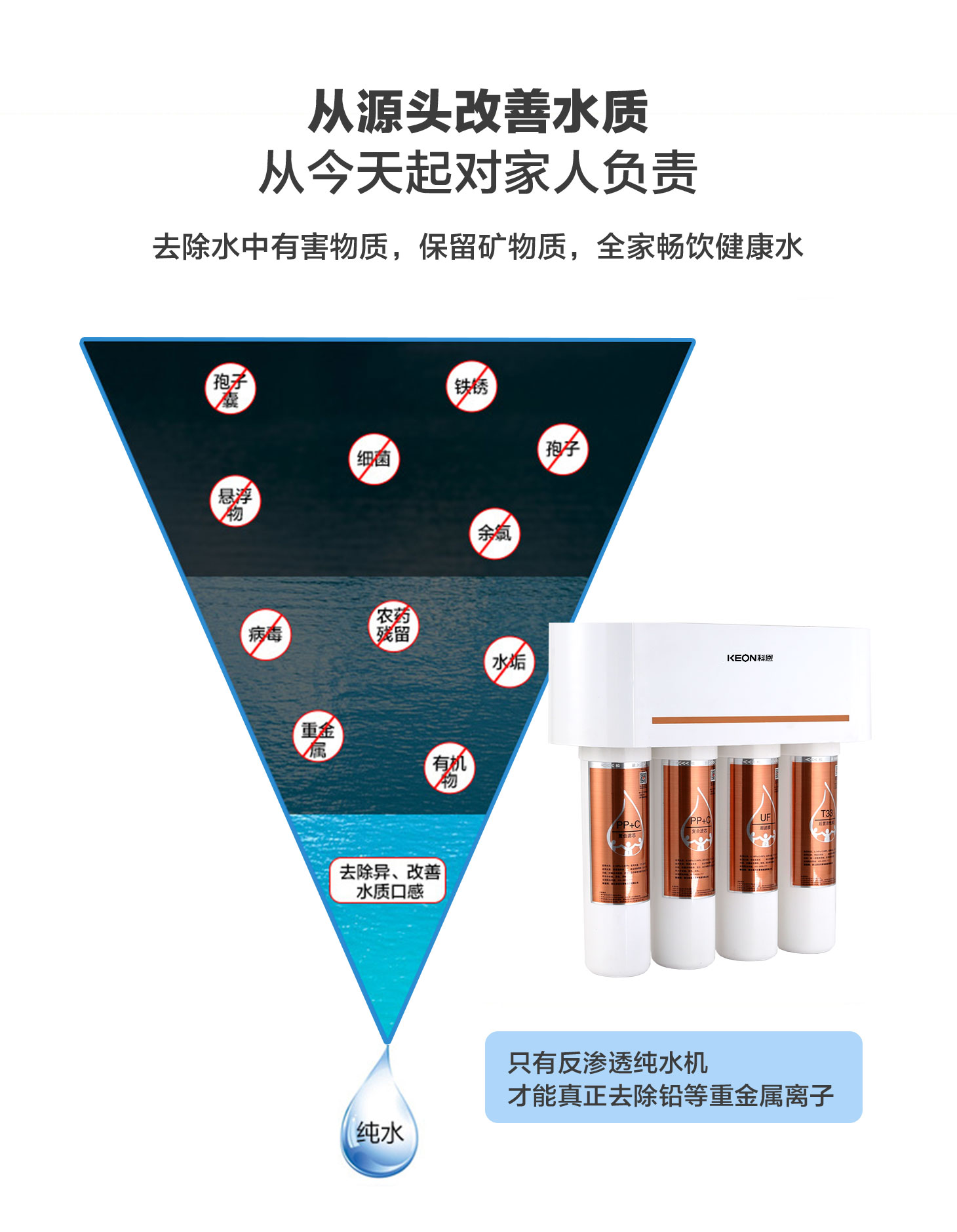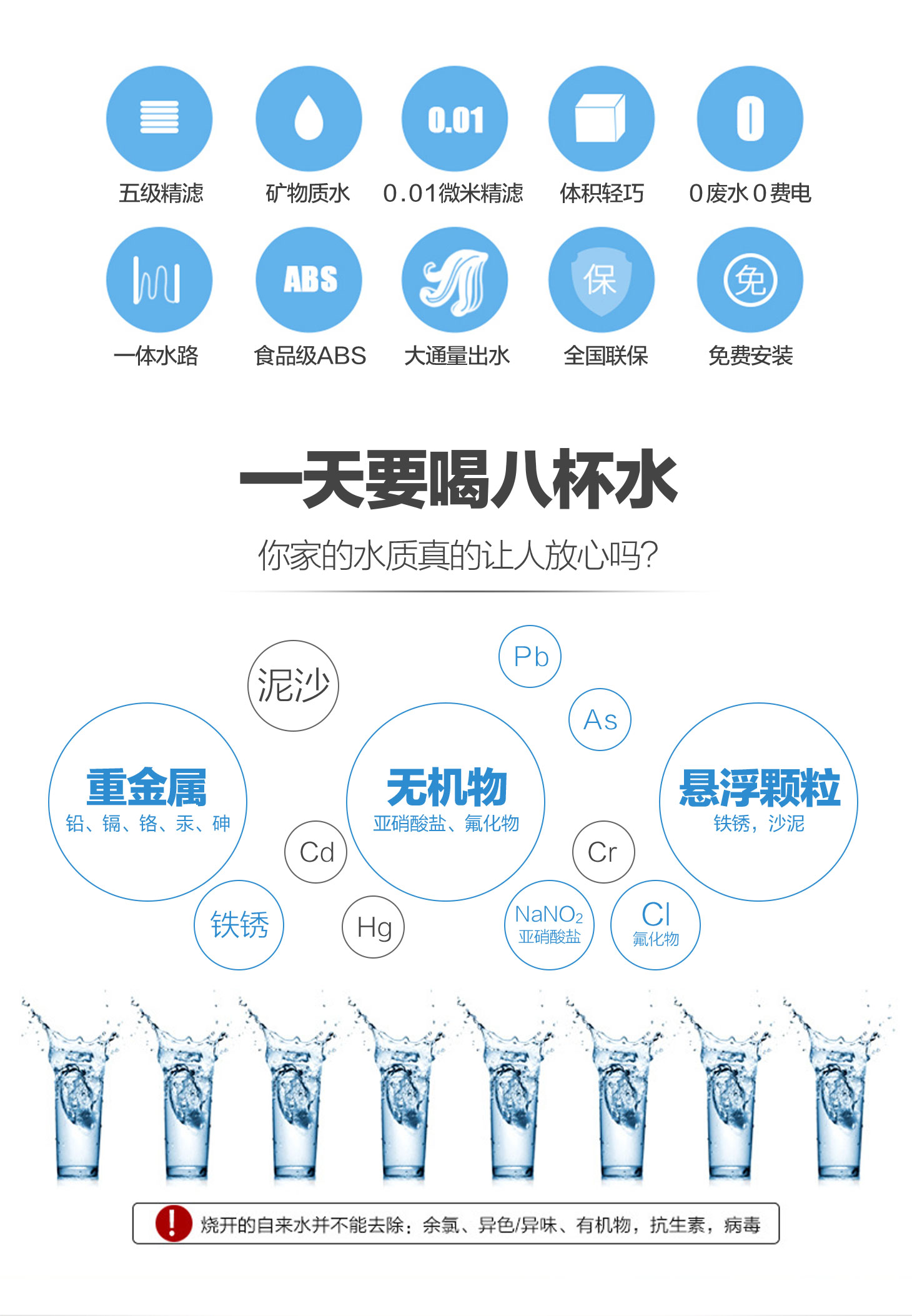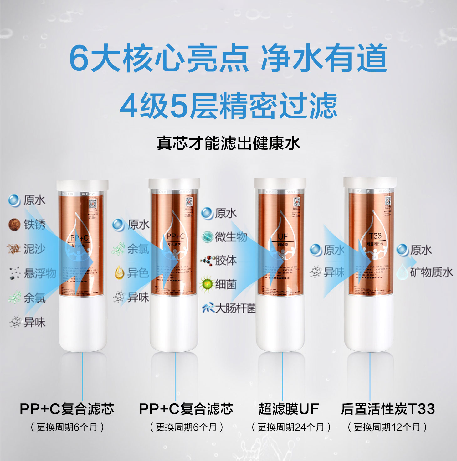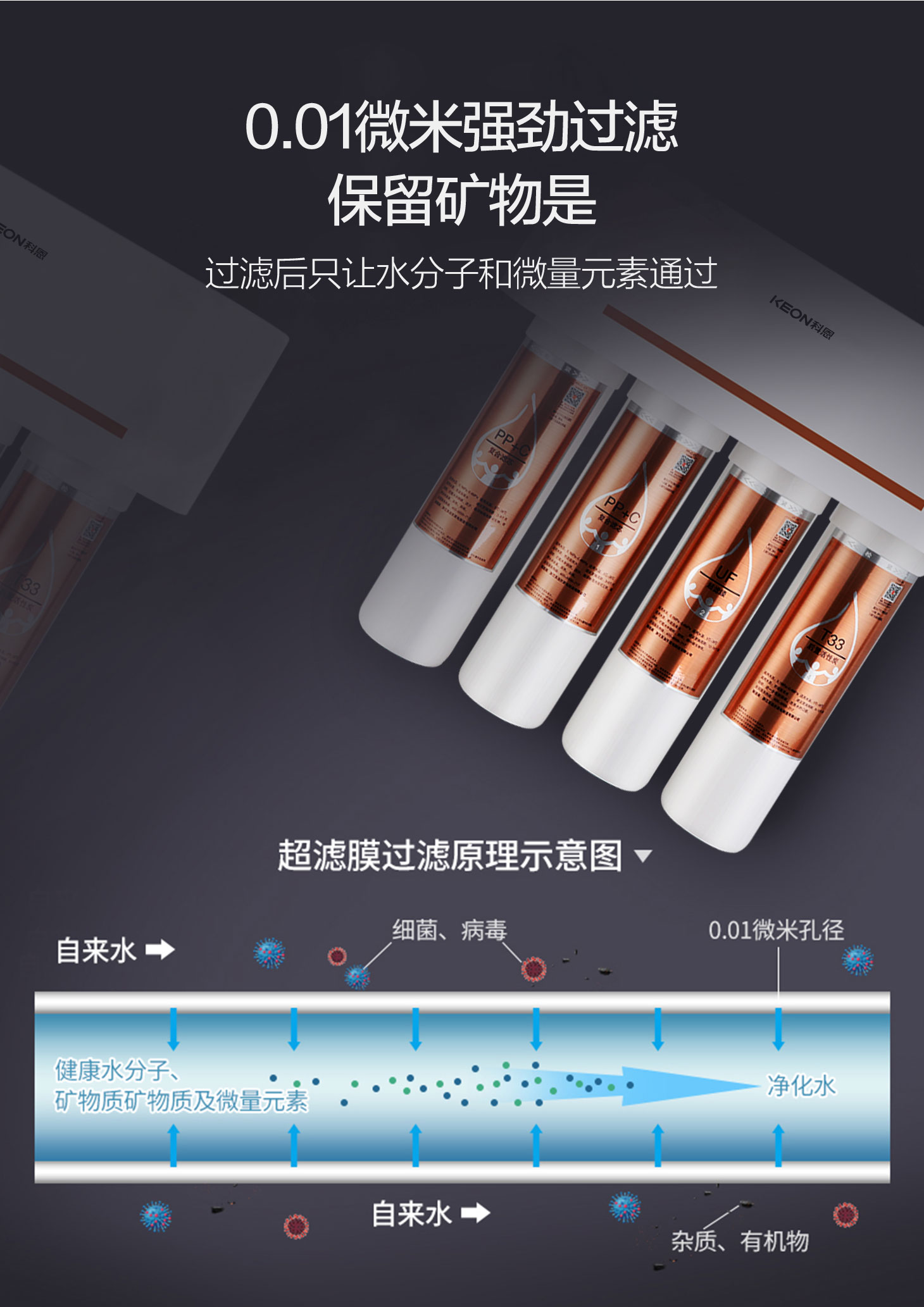 - 四重五級過濾,0.01微米超濾膜去除細(xì)菌和病毒。