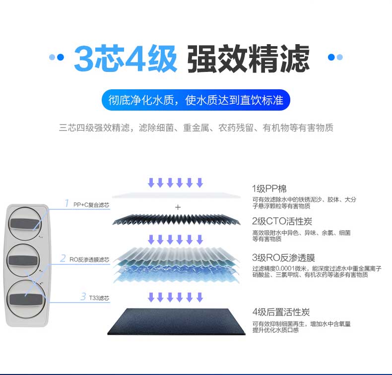 三芯四級強效精濾,濾除99%細菌重金屬